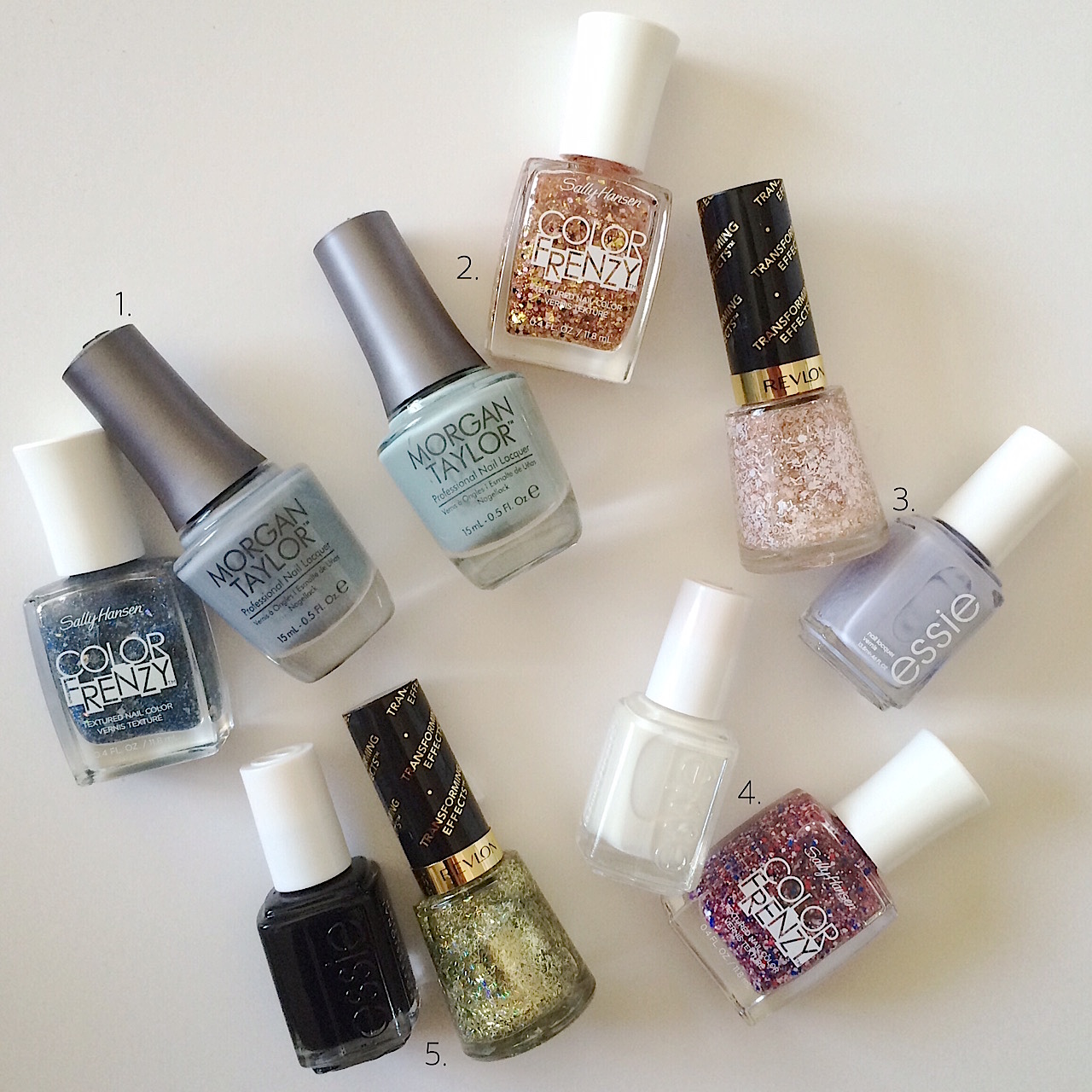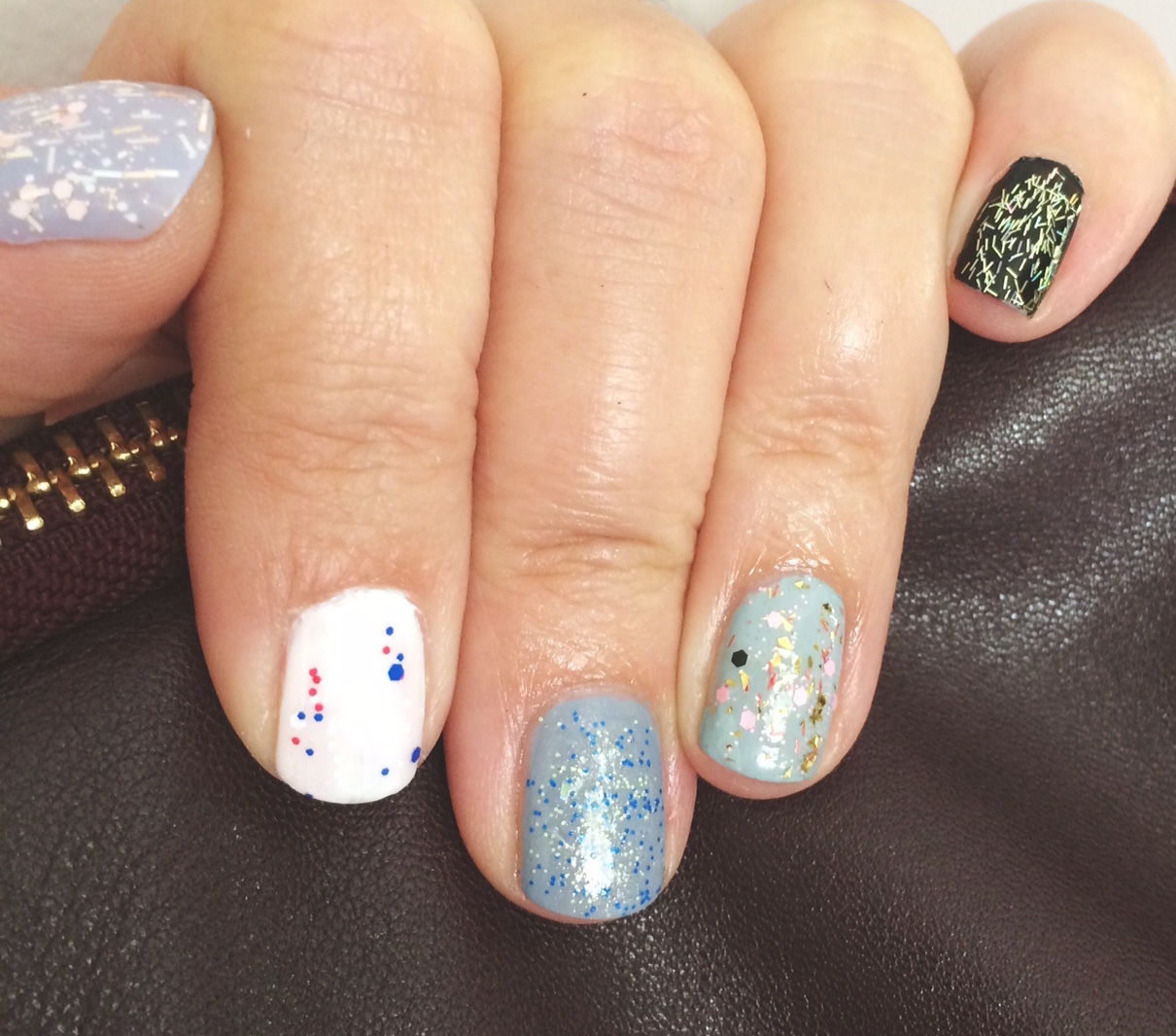As an example, I love how you can take a simplistic (yet stylish) white manicure up a style notch or two by painting over it with a red and blue glitter topcoat. If you find the effect too much, just paint the nail on your ring fingers with the top coat. My favourite look of the lot is on my ring finger. I love the combination of the pale blue with the gold, black and pink glitter – This is a mani Marie Antoinette would have platzed for! I also adore the gold over the black – it has a very 70’s ‘disco fever’ vibe. Again, I’d paint just one nail.