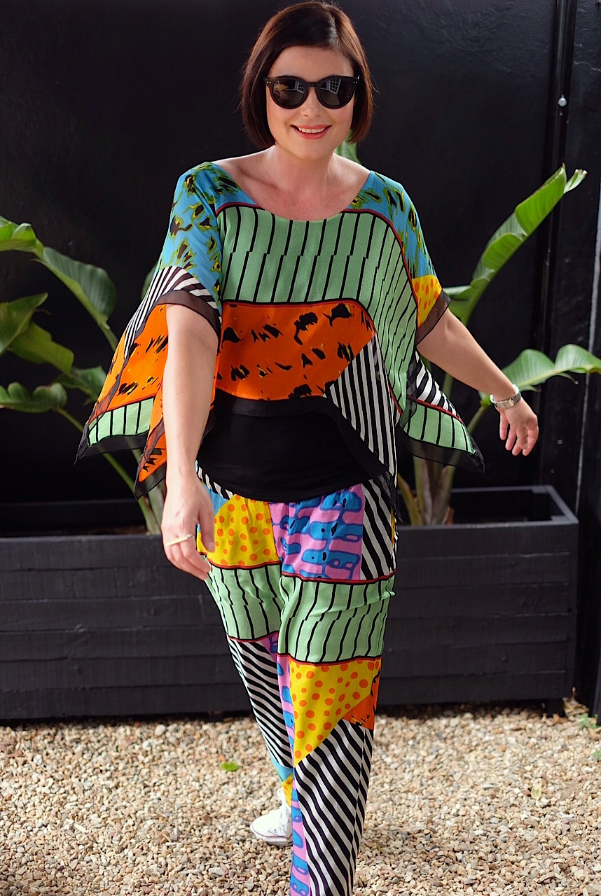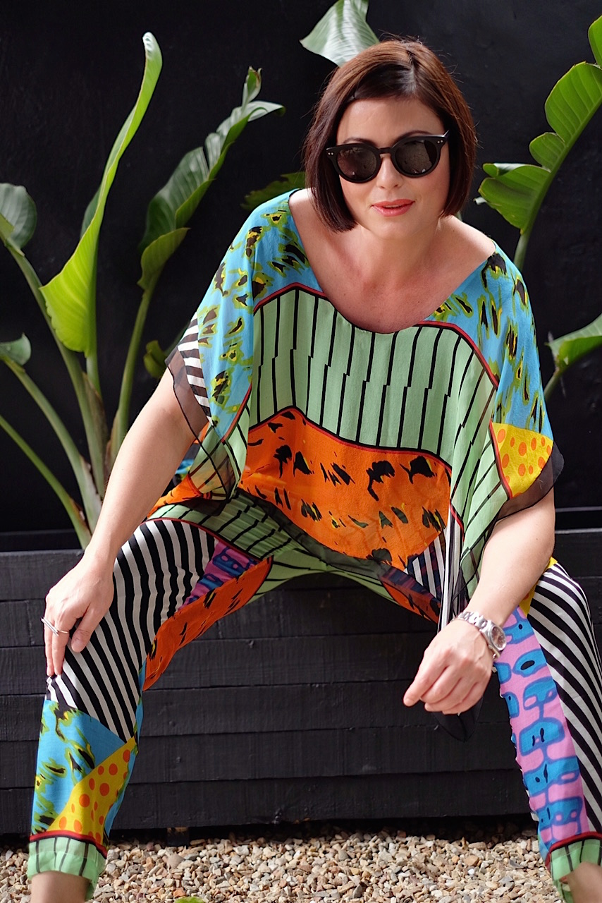The top, R1450 has a black jersey cammy top with the printed silk chiffon overlay sewn onto it. I love it, because it’s cut to perfection, concealing upper arms and tummy. I like how the silk chiffon overlay is cropped at the front, revealing the basic black cammy top that breaks up the bold prints, ensuring they don’t become too overwhelming.