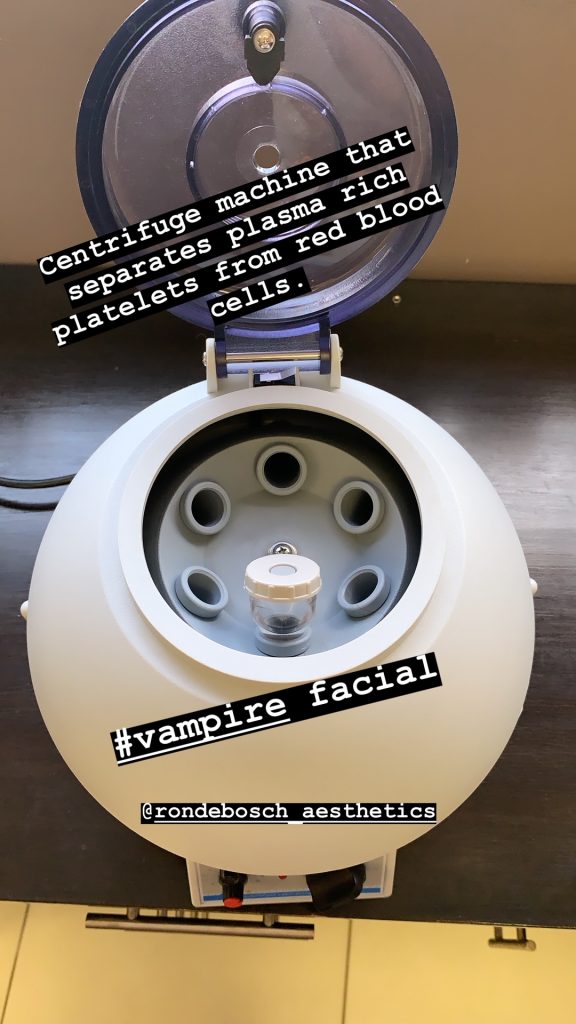 A vampire facial is a combination of micro-needling and Platelet Rich Plasma. PRP is a concentrate of platelet-rich plasma protein derived from the whole blood after it has been processed by spinning in a centrifuge to remove the red cells. The PRP has a greater concentration (9%) of growth factors than the whole blood, which sits at around 6%. It’s these growth factors – or Liquid Gold (as my dermatologist, Dr Dilshaad Asmal likes to call them) that assists the tissue to heal & repair. This plasma contains high levels of platelets, and these platelets have high levels of growth factors that are like little energy boosts for the skin, which stimulating cell turnover.