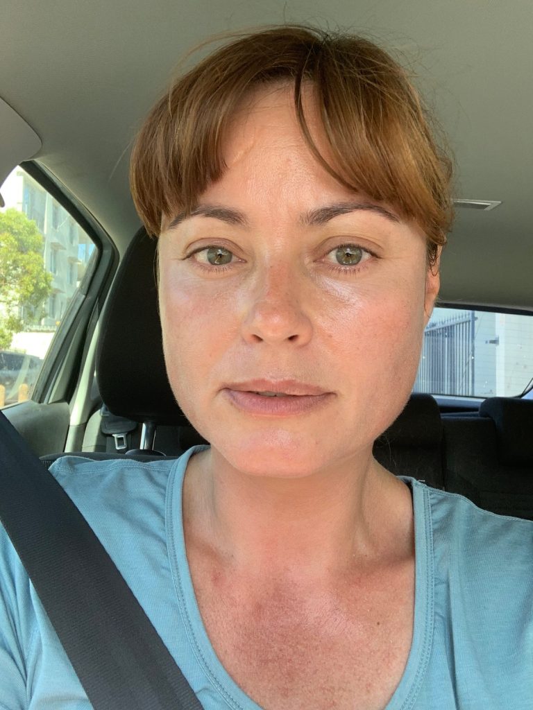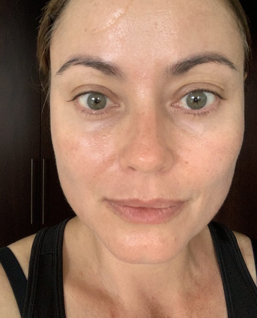 I can’t believe how good my skin looks! This pic was taken just after an intense gym session. Also, please look at the awful sun damage on my décolletage and remember to apply sunscreen to this area EVERY DAY, or, when you get to my age (44 yrs) your chest will look like this!!!