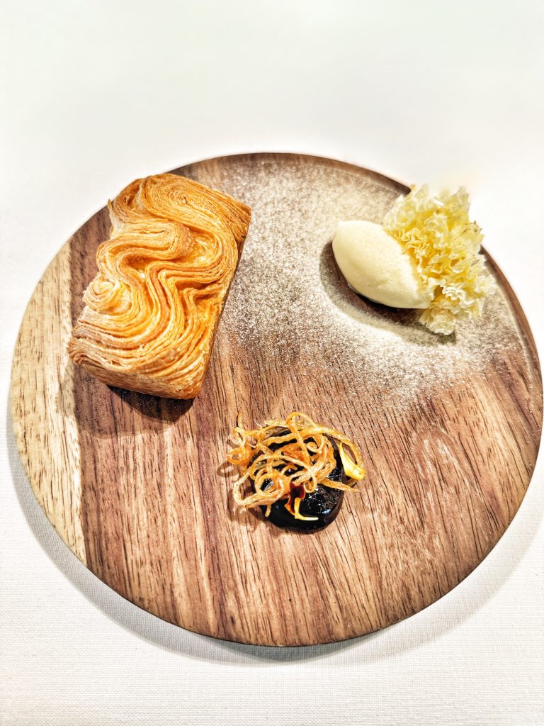 One of the standout moments is the ‘Bread’ course: a theatrical tableside shaving of Dalewood Boland cheese on a girolle, creating delicate rosettes that steal the show.